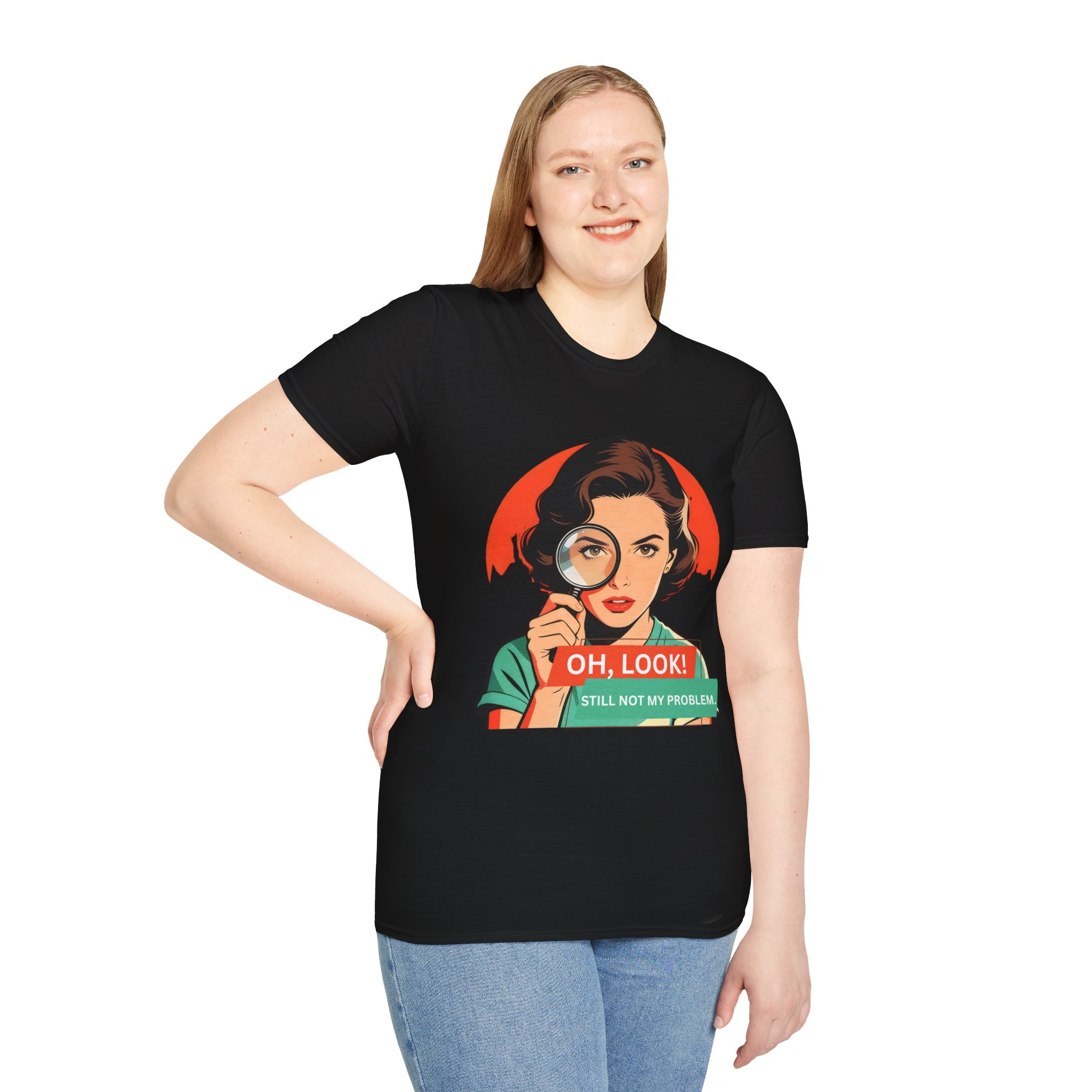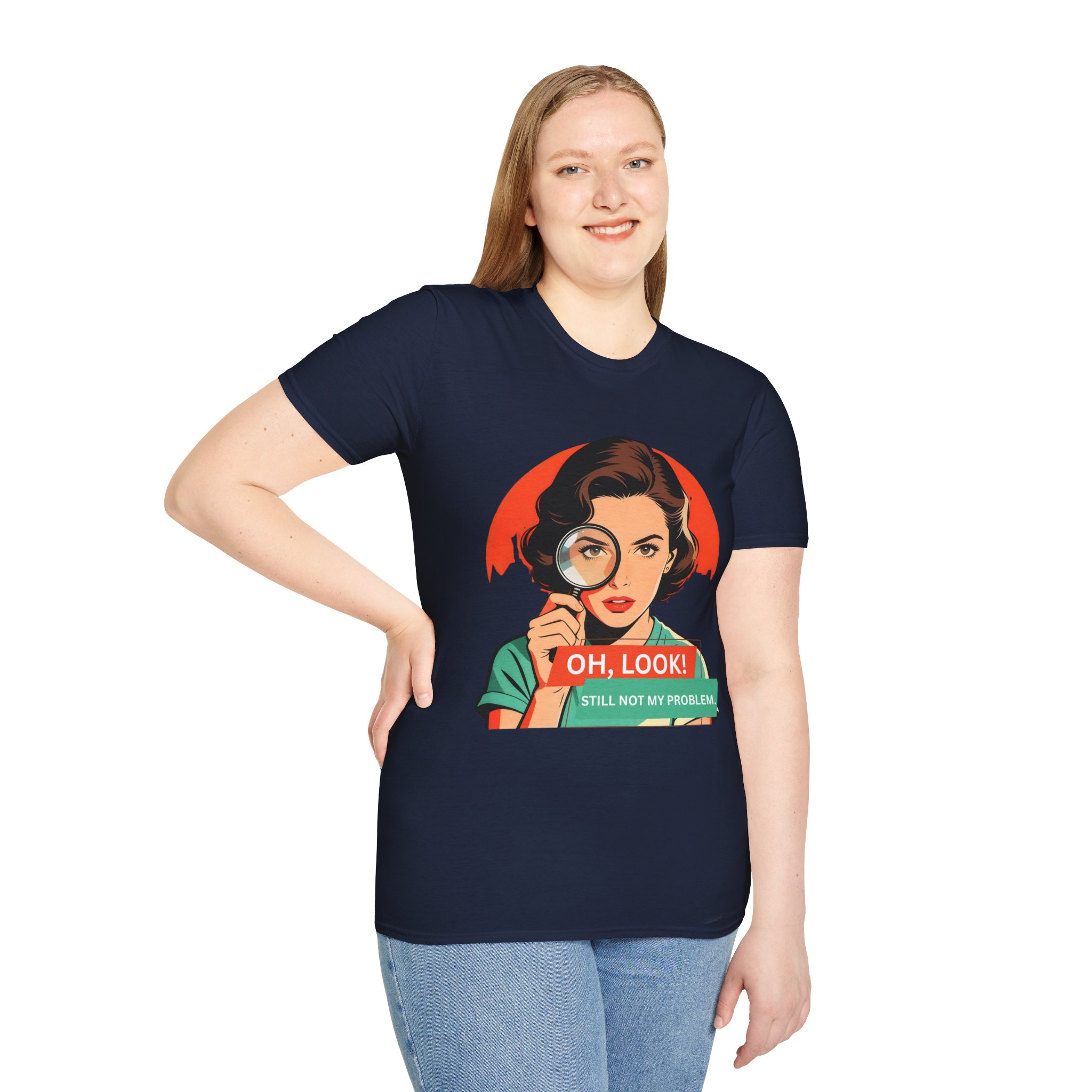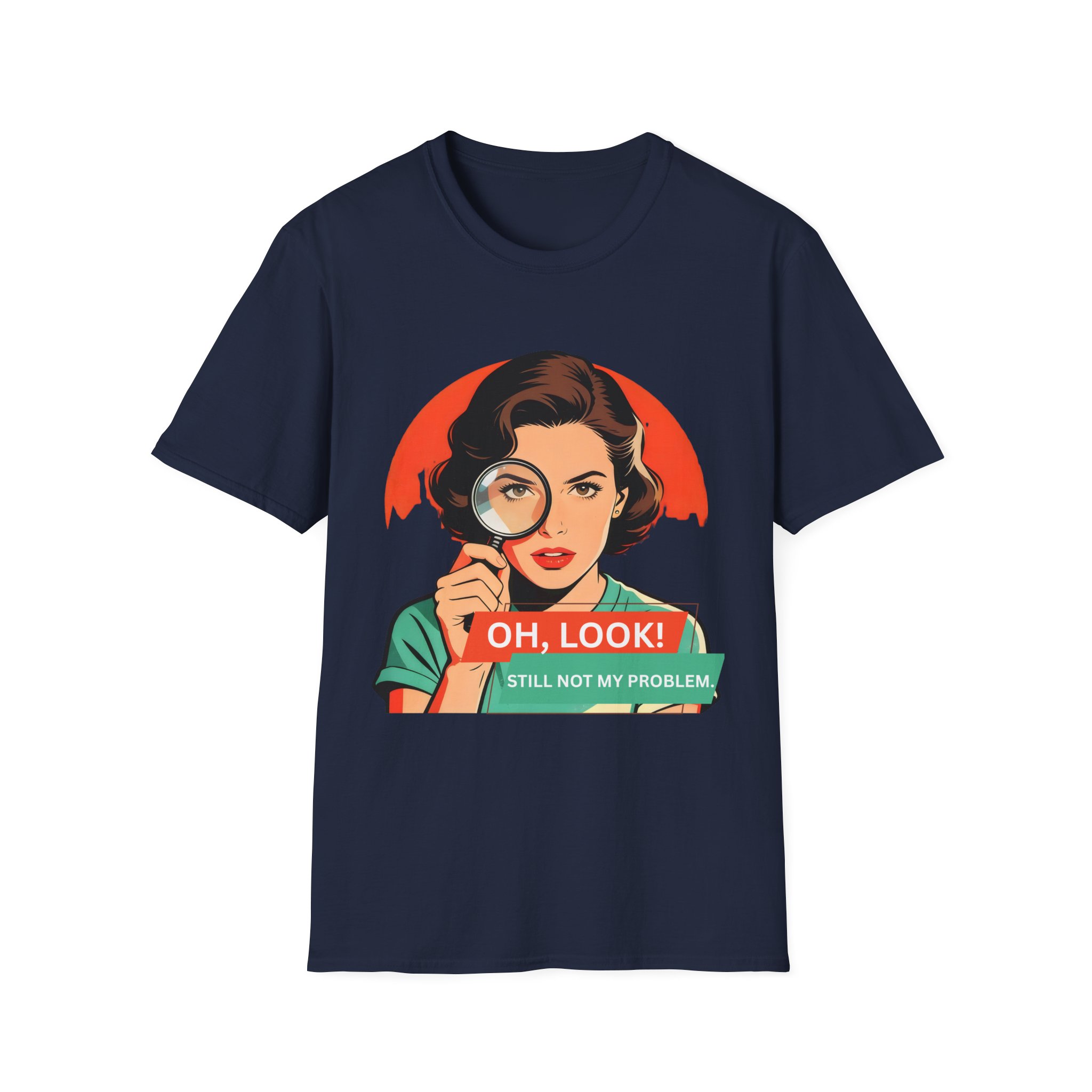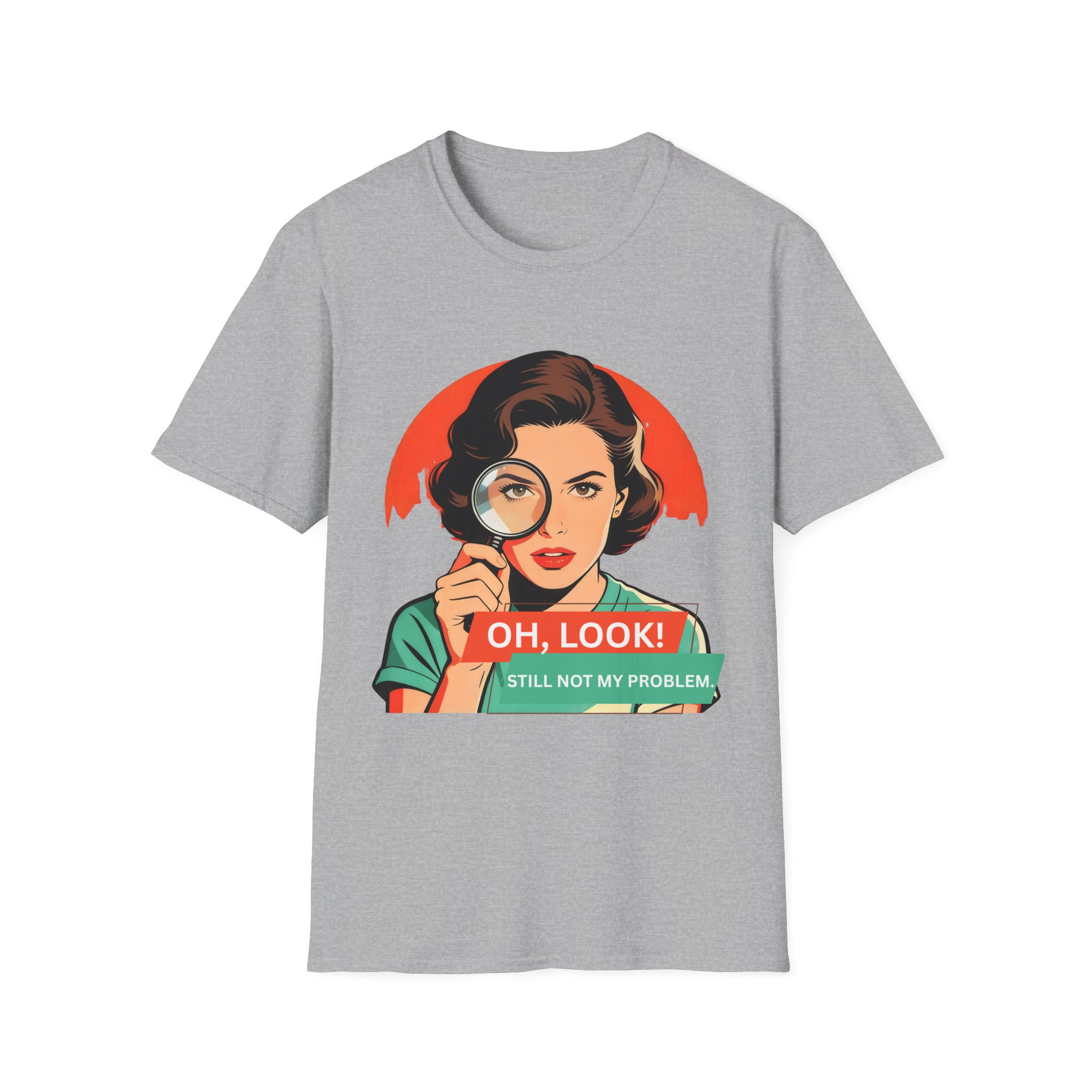 Make a bold statement with this sarcastic retro-inspired graphic tee. Featuring a confident woman with a magnifying glass and the phrase “Oh, look! Still not my problem,” this design blends vintage style with modern attitude. Soft, breathable, and eye-catching, it’s perfect for expressing personality with humor and effortless confidence.