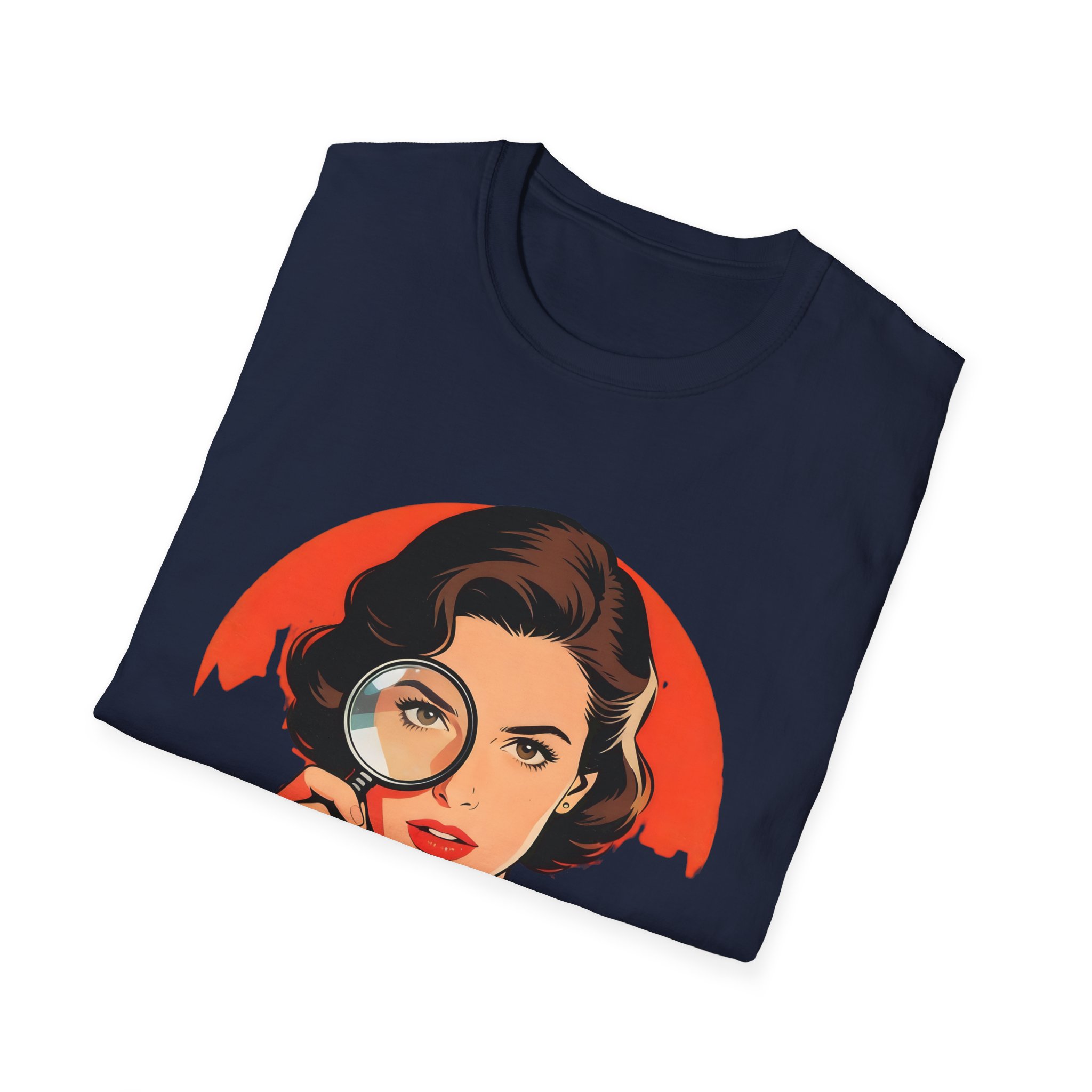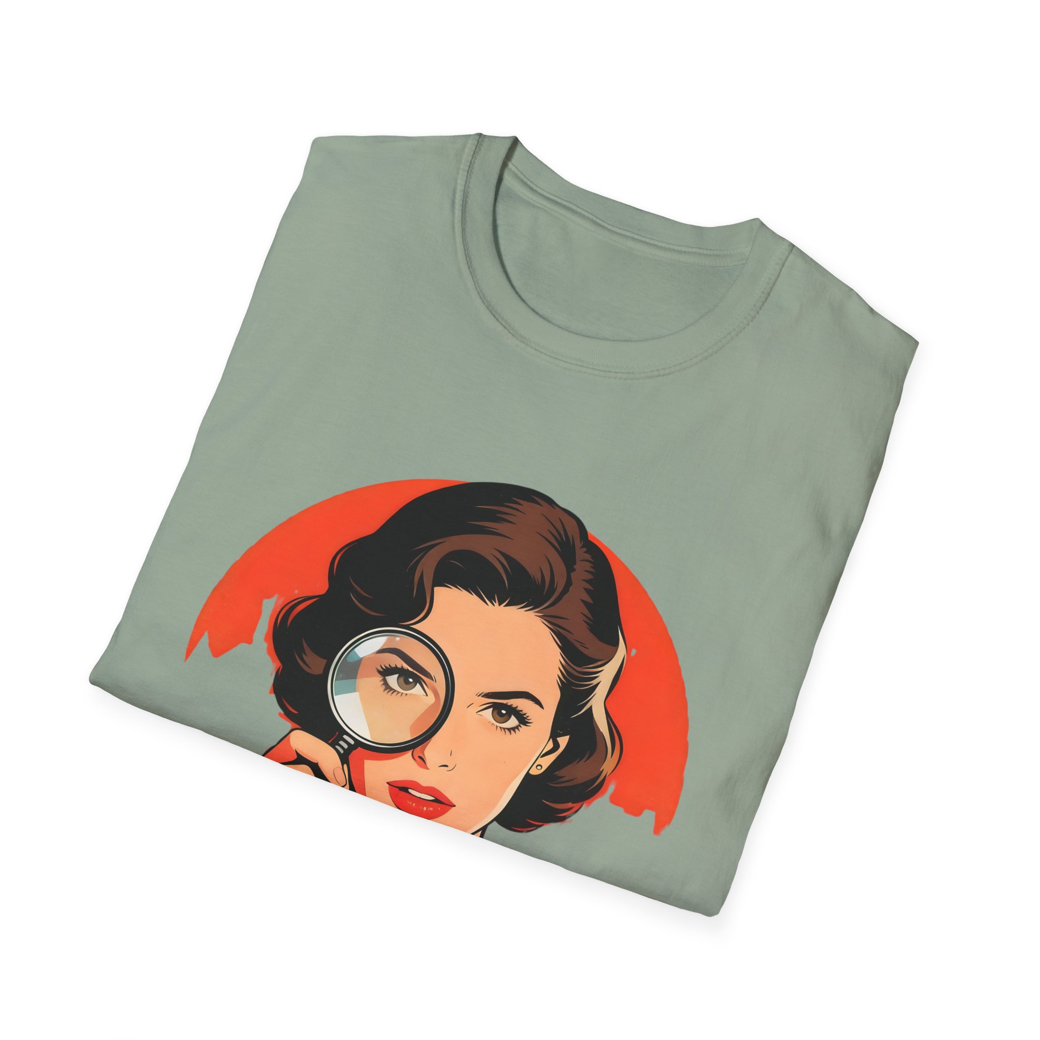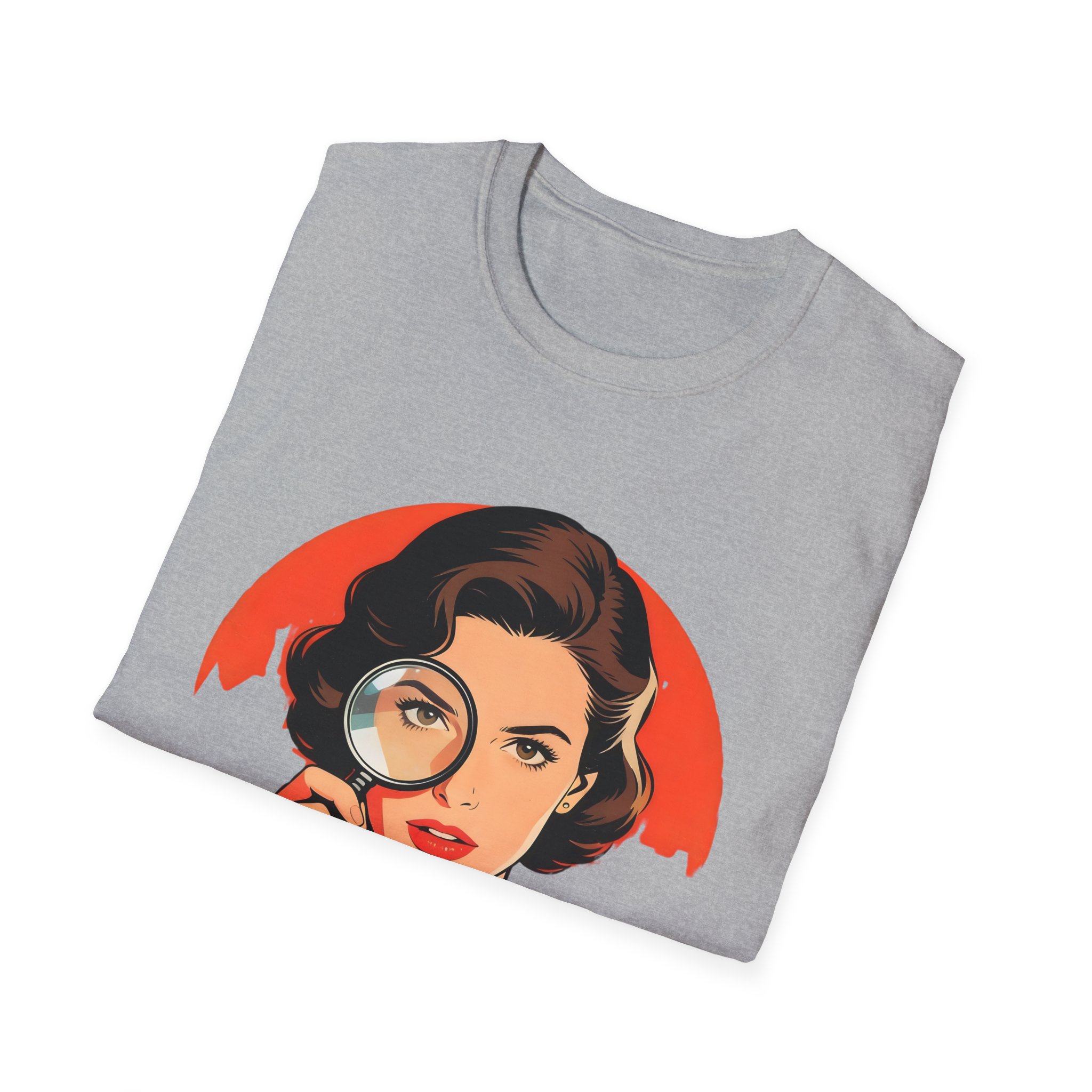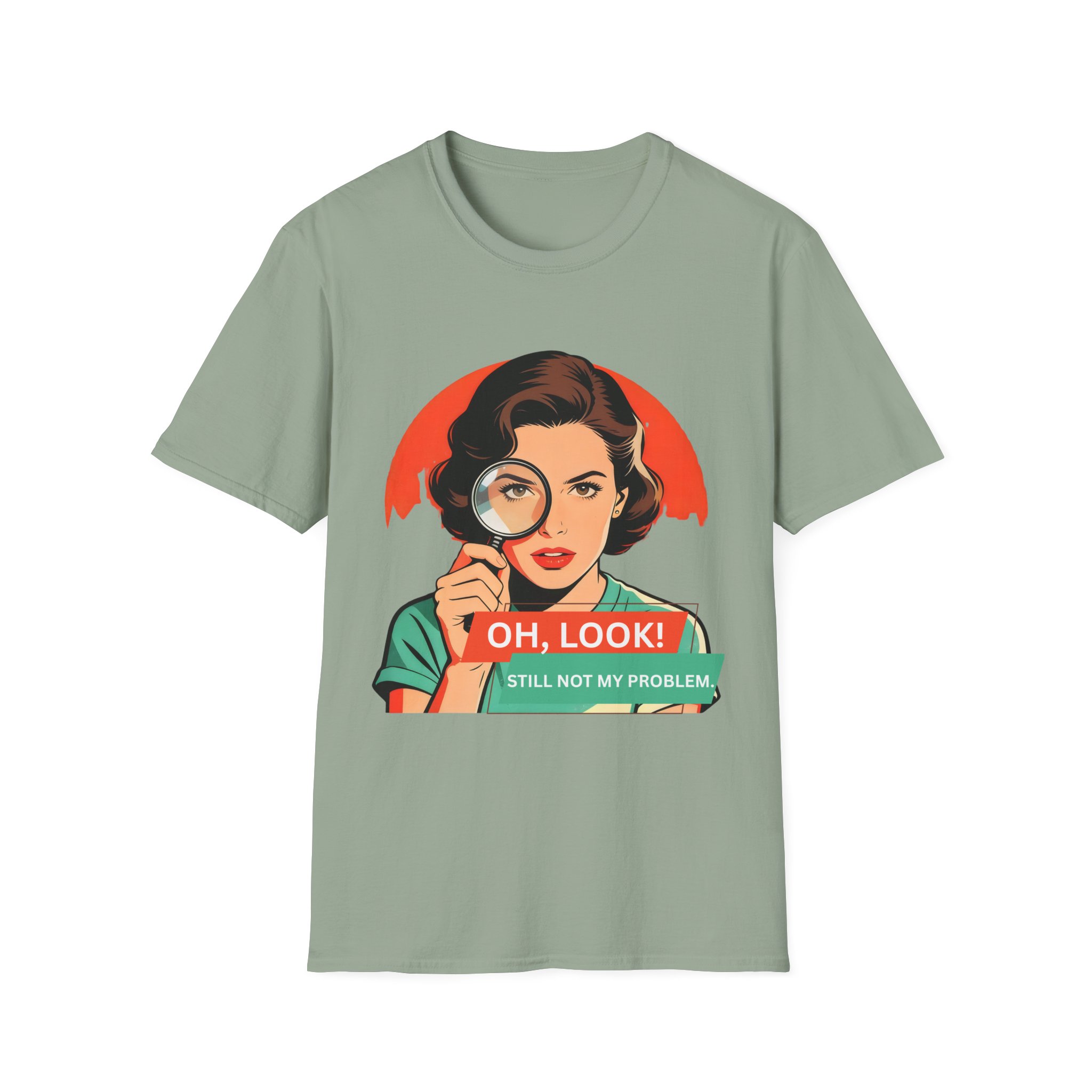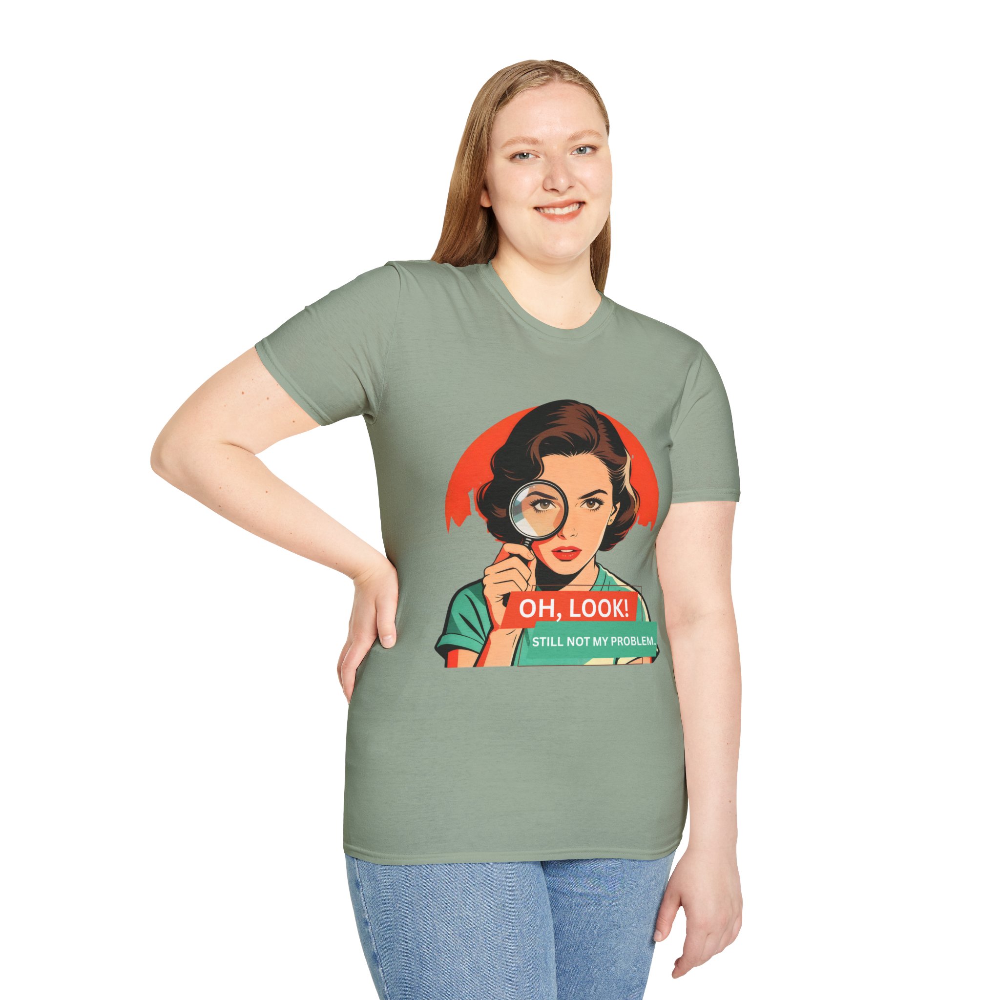 Make a bold statement with this sarcastic retro-inspired graphic tee. Featuring a confident woman with a magnifying glass and the phrase “Oh, look! Still not my problem,” this design blends vintage style with modern attitude. Soft, breathable, and eye-catching, it’s perfect for expressing personality with humor and effortless confidence.