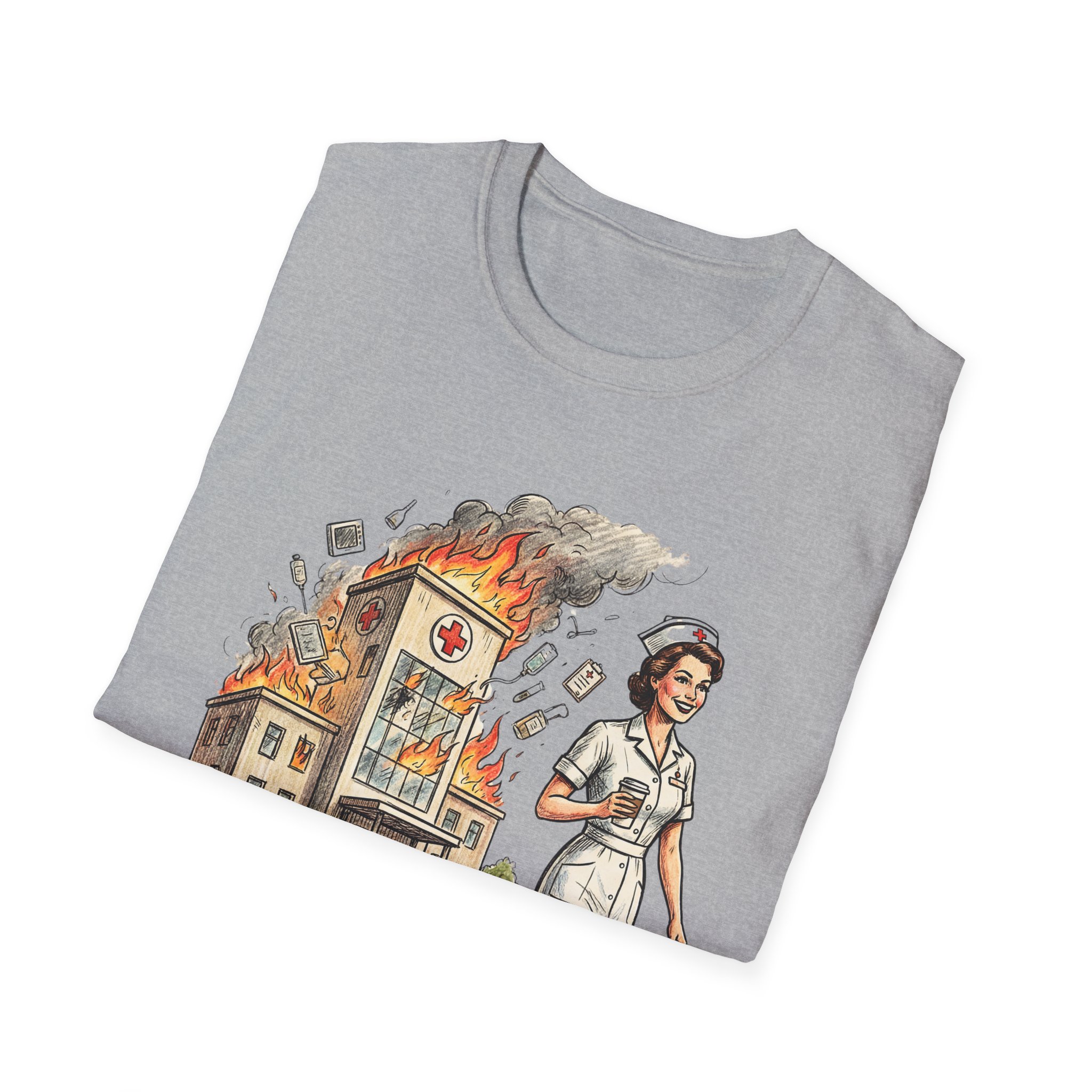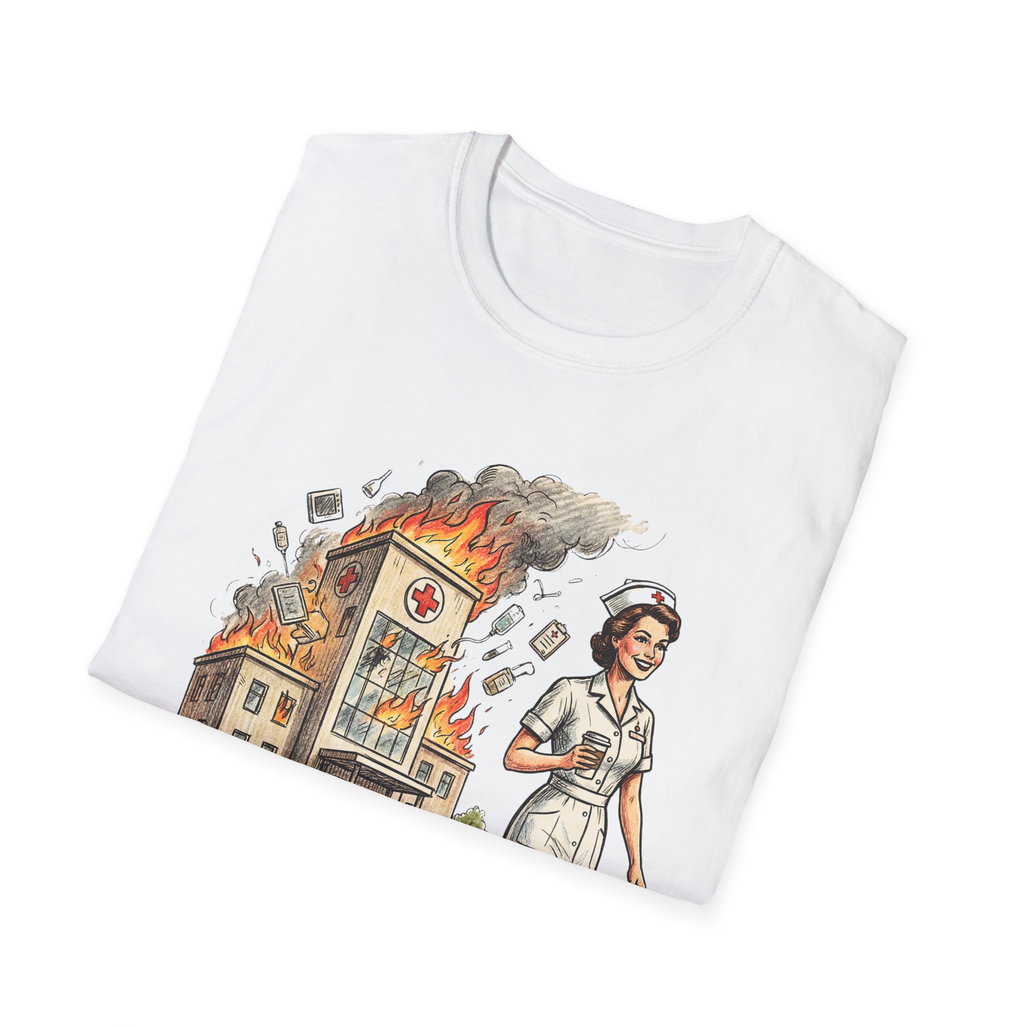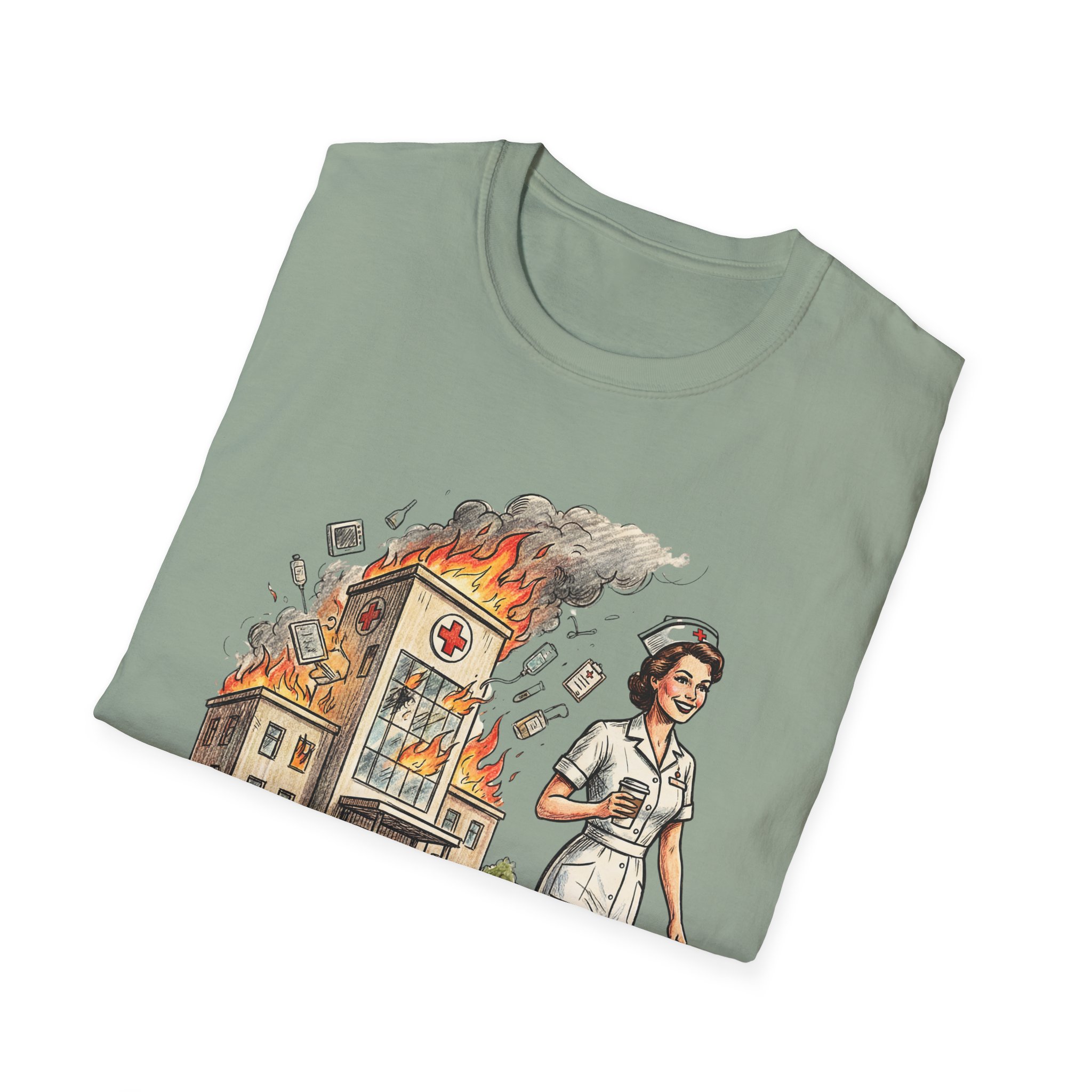 This lightweight crew tee showcases a striking and humorous illustration of a nurse calmly walking away with coffee in hand while a hospital burns behind her. The design perfectly captures the reality of burnout, stress, and keeping it together—blending dark humor with a bold vintage-inspired style.