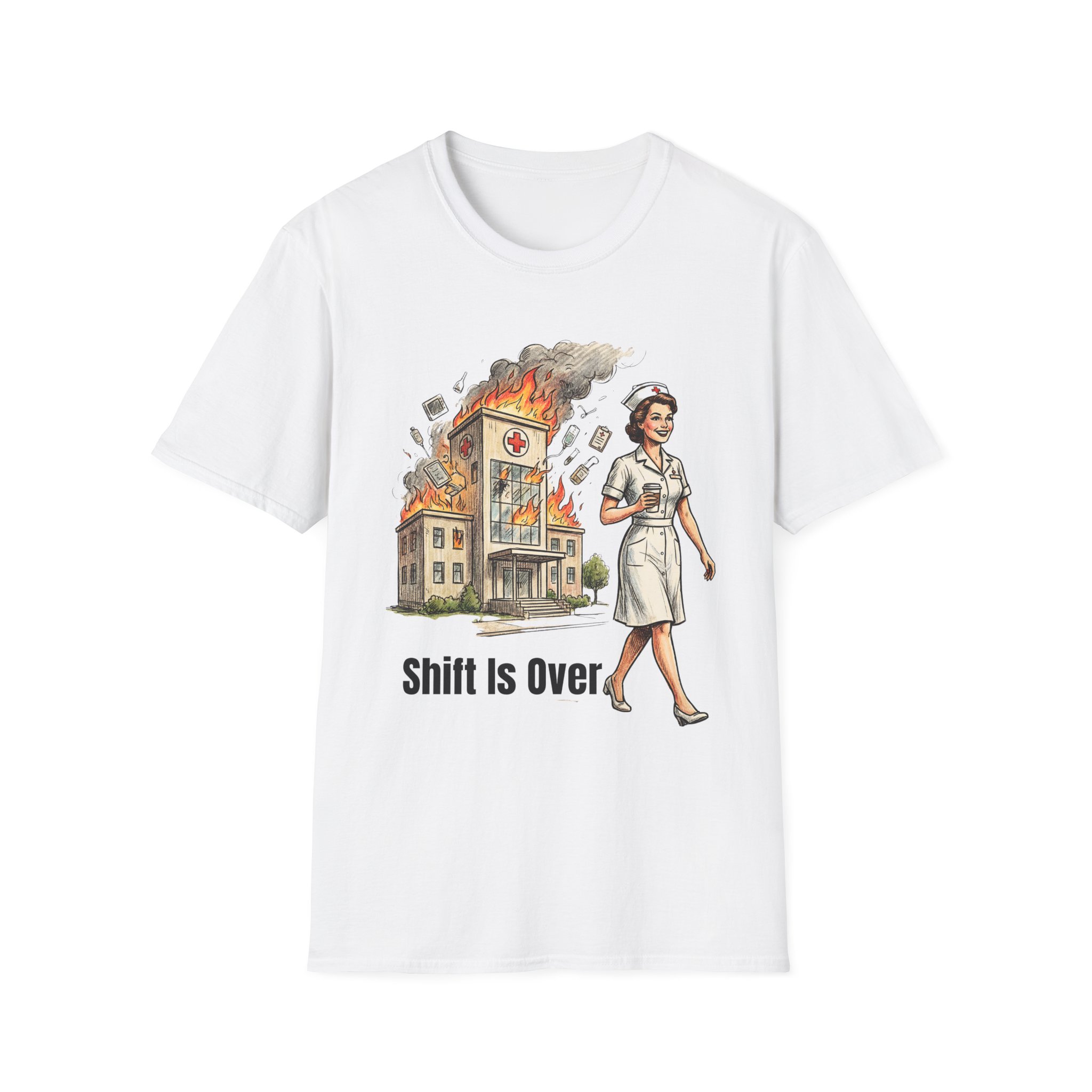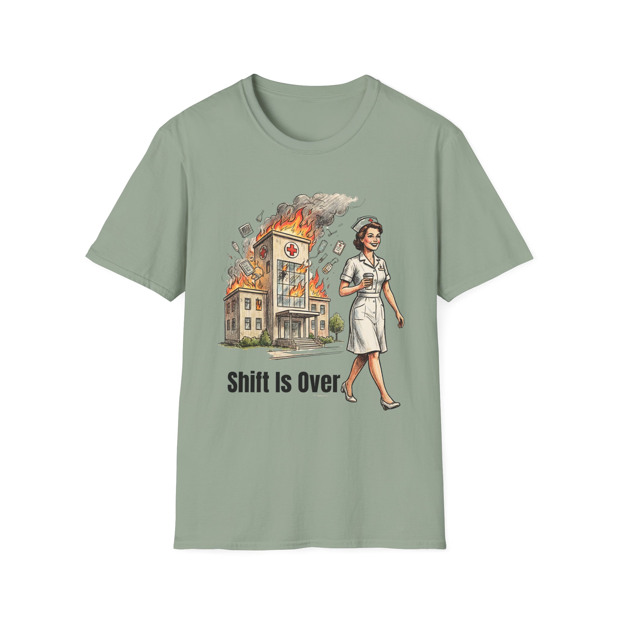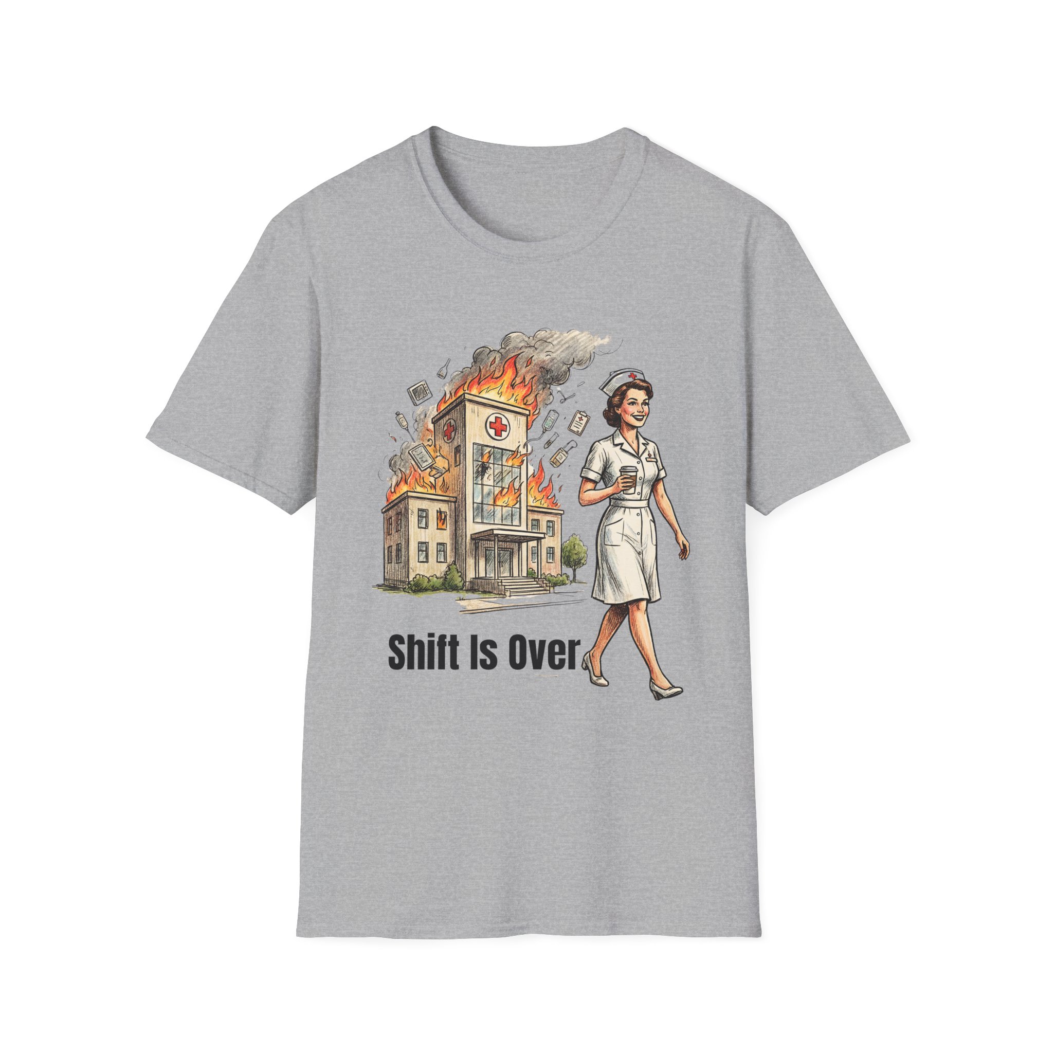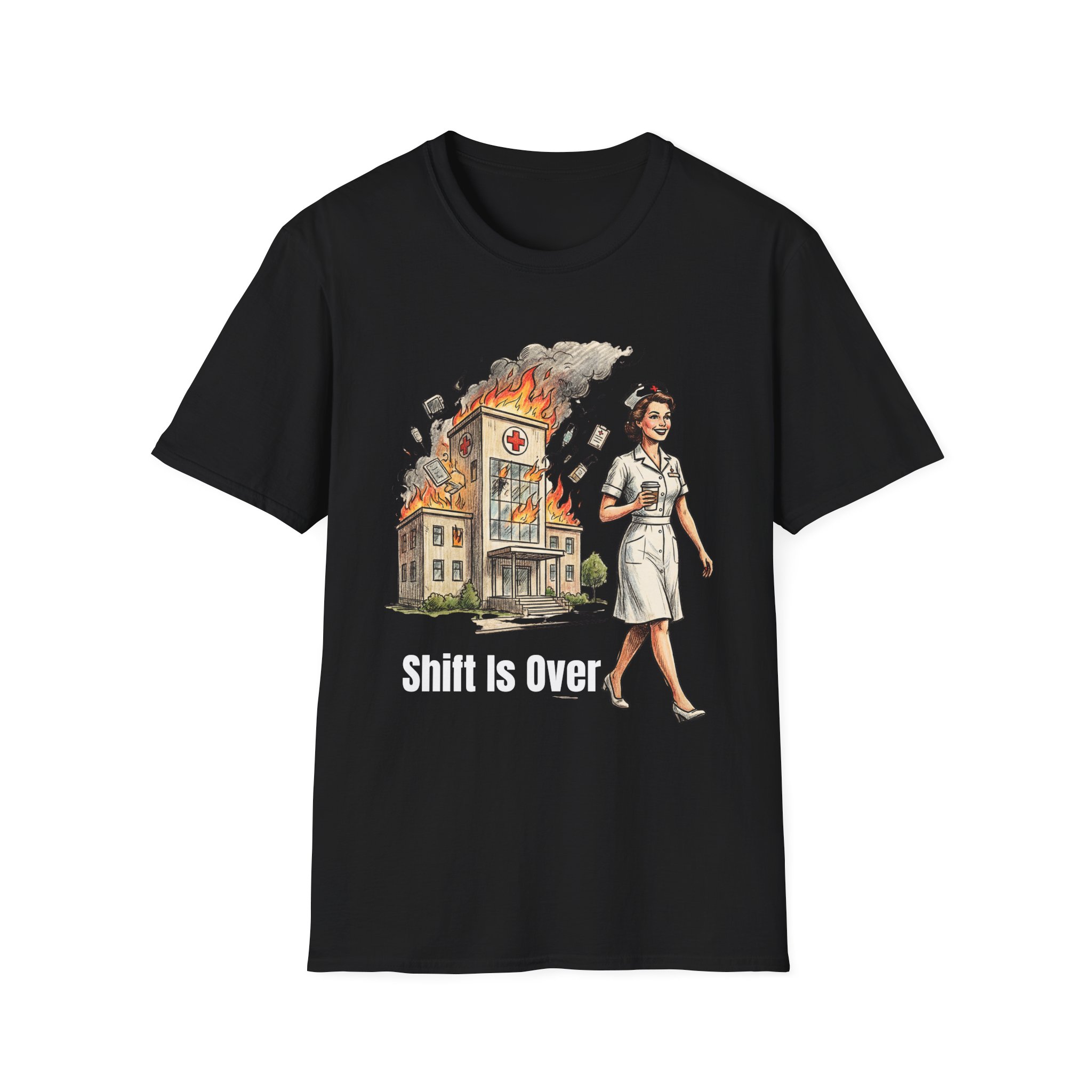 Shift Is Over Nurse T-Shirt — Retro Nurse Walking Away from Burning Hospital Graphic TeeShift Is Over Nurse T-Shirt — Retro Nurse Walking Away from Burning Hospital Graphic Tee